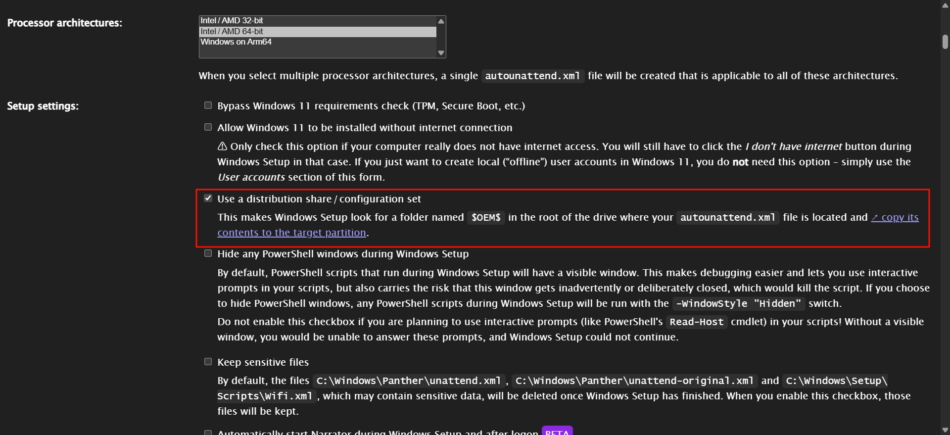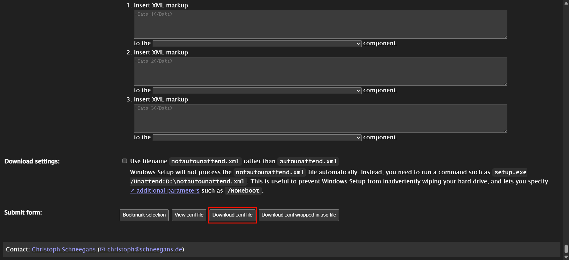 依据自己的喜好修改其他配置,之后选择 Download .xml file 下载 Autounattend.xml 文件。