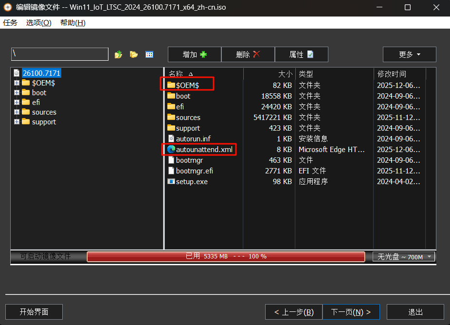 Autounattend.xml文件复制到镜像根目录下。 - 将